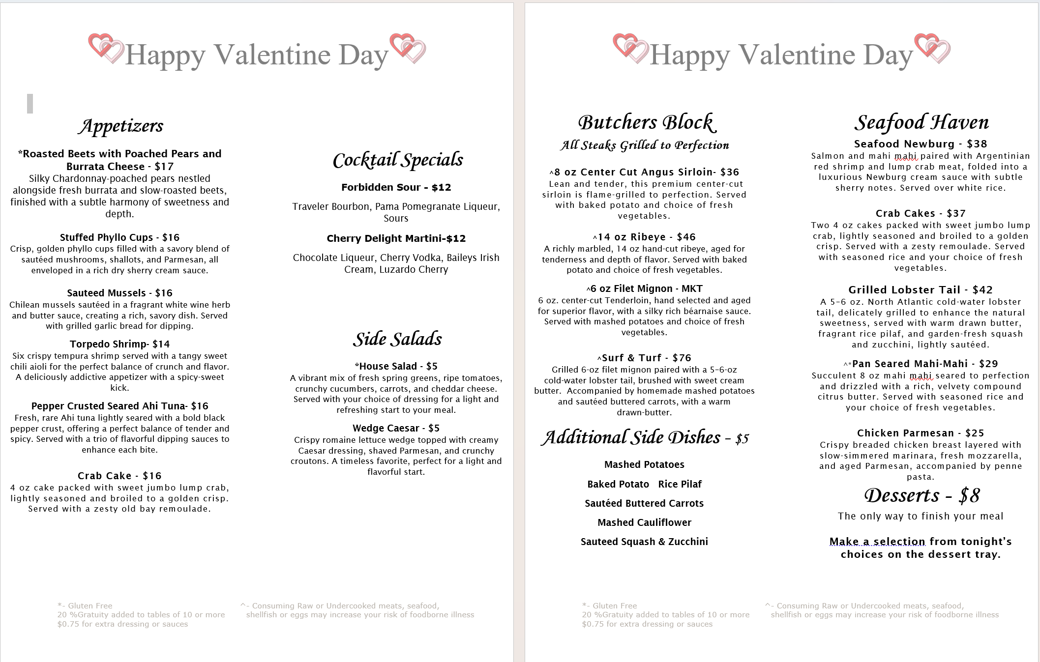 Valentine’s Day Menu Make your reservations now! Menu offered Friday, Saturday and Sunday. February 13, 14, and 15th